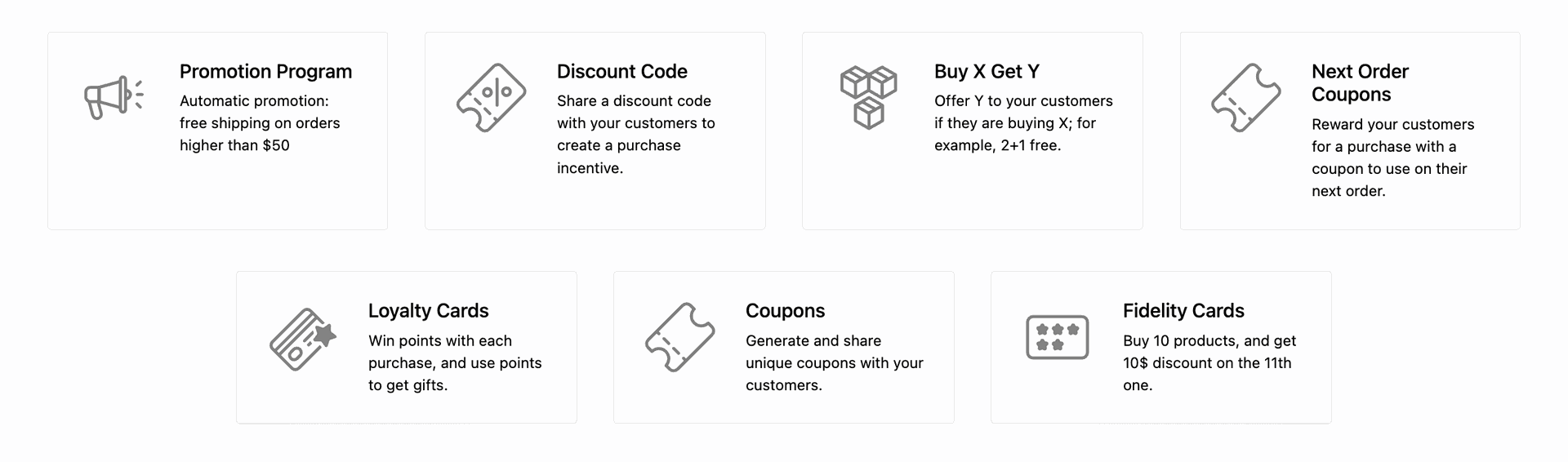 Offer promotions, coupons, loyalty, and gift cards to customers. Track their usage across the Point of Sale, Sales, and eCommerce apps.